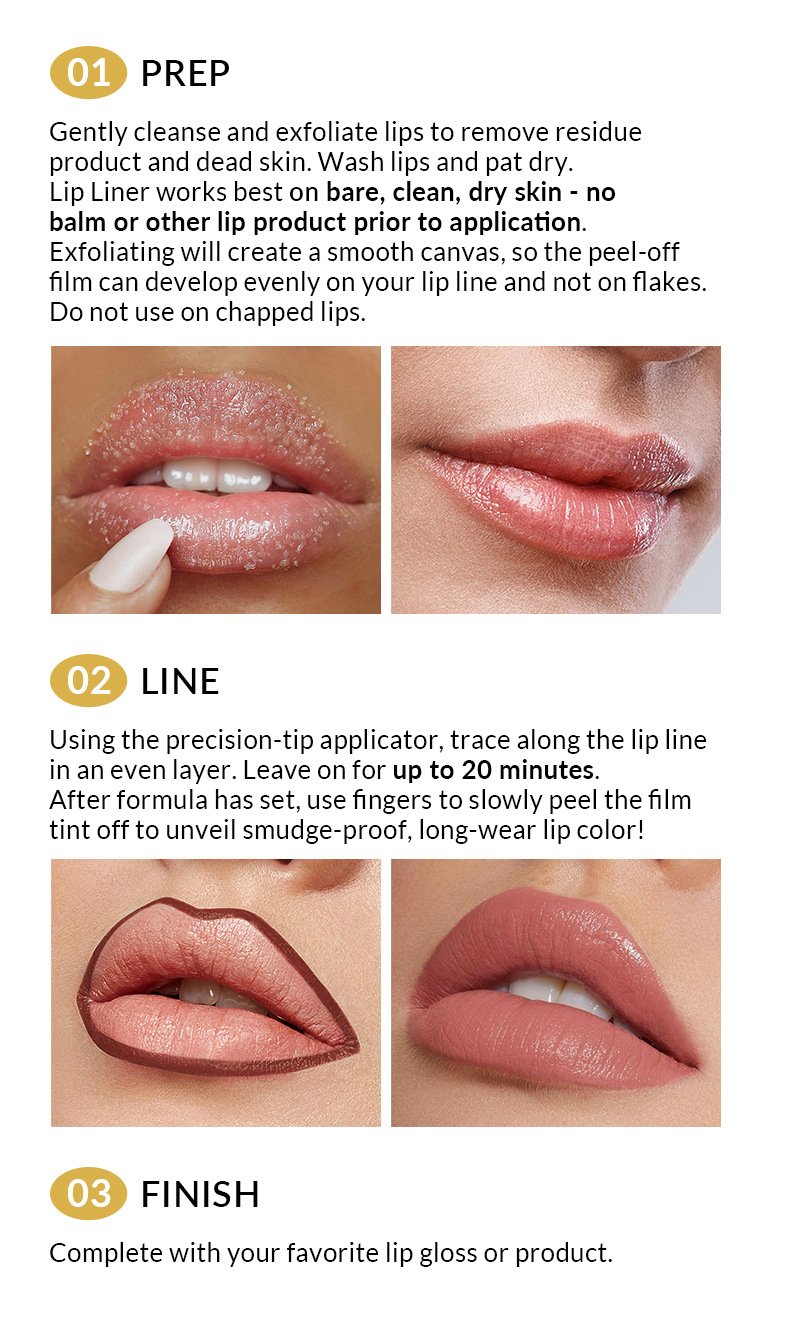 Apply Peel Off Lip Liner Stain using the precision-tip applicator.Leave it on for 10-20 minutes, then peel off to reveal vibrant, long-lasting color.Enjoy perfectly stained lips that stay smudge-proof all day.